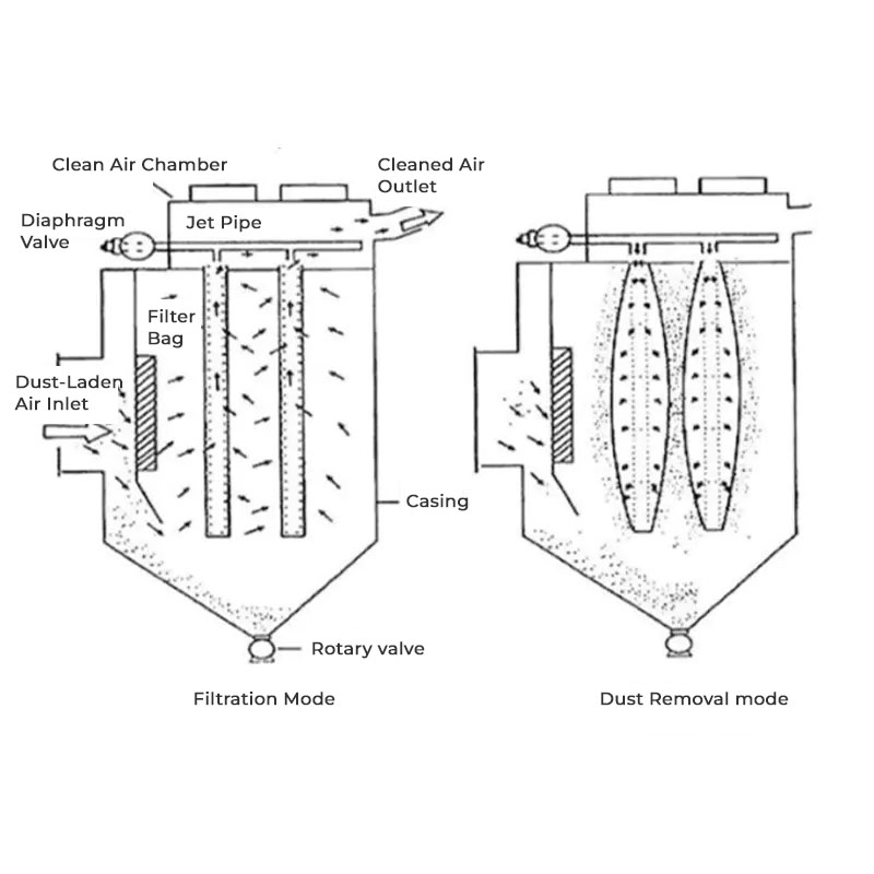 Dalam sistem ini, udara yang mengandung debu pertama-tama melewati kantong filter, tempat partikel debu ditangkap. Udara yang dimurnikan kemudian dilepaskan ke atmosfer. Mekanisme pulse jet memastikan kantung filter bersih dan efisien, sehingga tidak perlu lagi sering dibersihkan atau diganti secara manual.